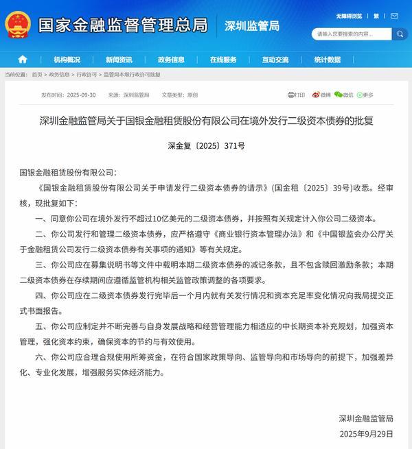 中国网财经10月10日讯日前,深圳金融监管局发布相关批复,同意国银金融租赁股份有限公司(简称“国银金租”)在境外发行不超过10亿美元的二级资本债券,并按照有关规定计入国银金租二级资本。