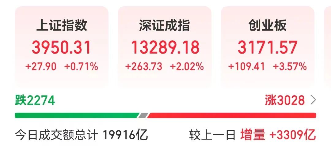 A股高开高走,截至收盘,沪指涨0.71%创十年新高,创业板指涨3.57%。上涨个股超3000只;两市全天成交1.97万亿元,较上一日放量成交3303亿元。