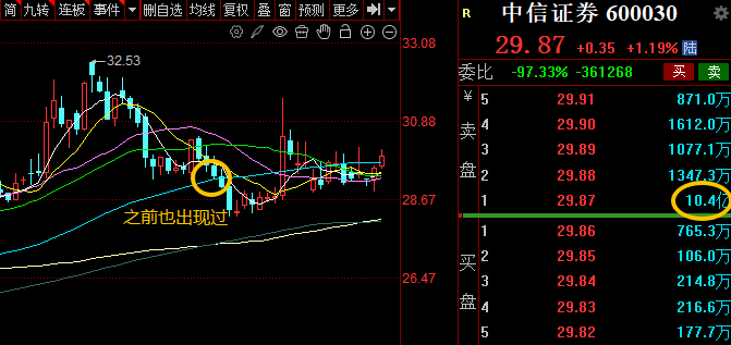 9月29日,中信证券盘中一度大涨9%,随后震荡回落,同样也出现了密集的压单。