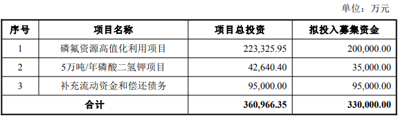 本次发行的募集资金总额不超过330,000.00万元(含本数),扣除发行费用后,拟全部用于以下项目:磷氟资源高值化利用项目、5万吨/年磷酸二氢钾项目、补充流动资金和偿还债务。