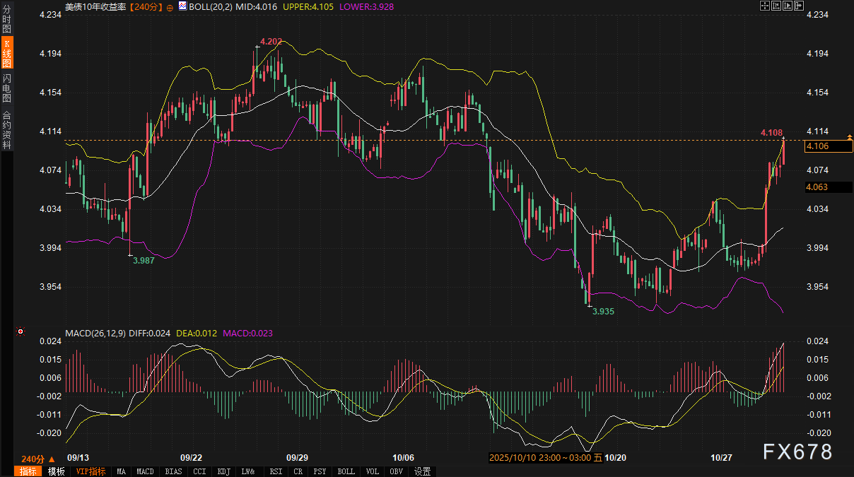 技术分析师指出,此前收益率跌破4%曾引发“完美定价”预期,但美联储的表态打破了这一均衡,推动收益率自下轨反弹。尽管技术面偏多,但若MACD柱状图收窄,则可能回归4.03%-4.08%的震荡区间。