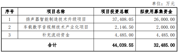 上声电子于10月30日发布的《向不特定对象发行可转换公司债券预案(修订稿)》显示,本次向不特定对象发行可转换公司债券的募集资金总额不超过32,485万元(含本数),扣除发行费用后的募集资金净额将用于投入以下项目:扬声器智能制造技术升级项目、车载数字音视频技术产业化项目、补充流动资金。