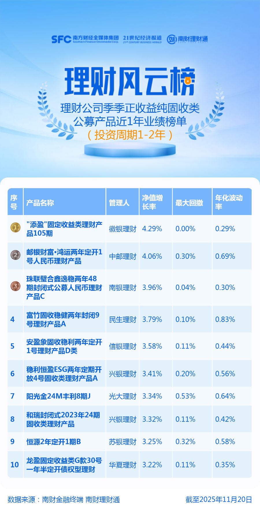 产品统计范围为理财公司发行的投资周期在1-2年(含)的公募纯固收产品,且近一年每个完整的自然季季末均为正收益。产品统计截止日期为2025年11月20日,统计区间为近一年。