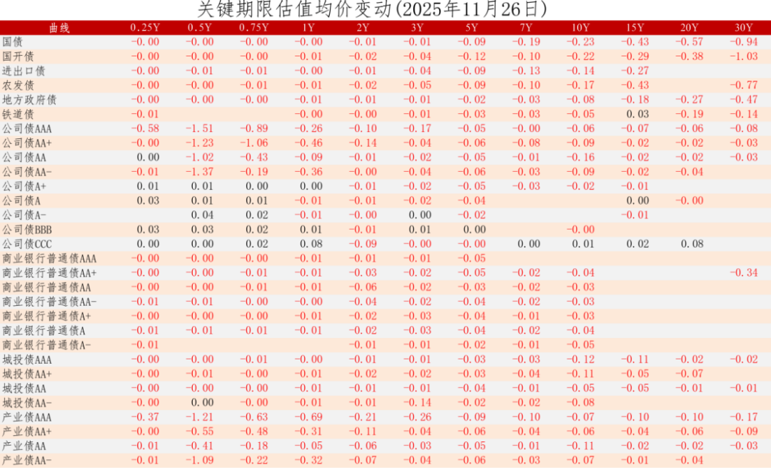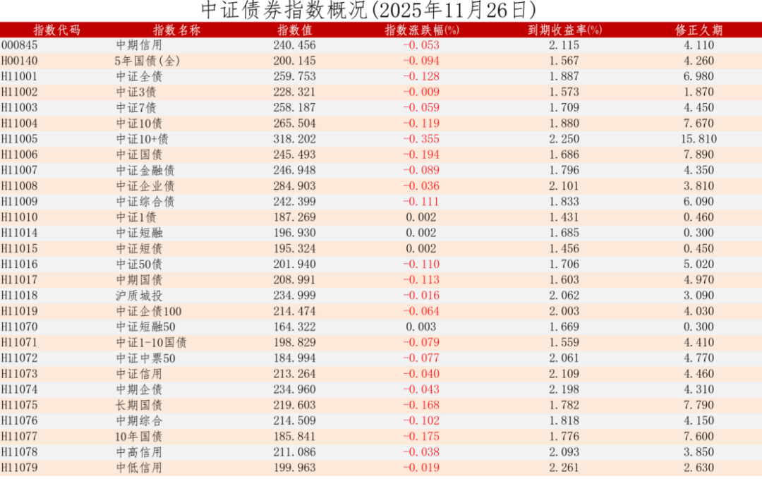 当日中证债券指数多数下跌。中证全债指数较前日下跌0.128%,到期收益率1.887%,修正久期6.98。当日跌幅居前的三条指数是中证10+债指数、中证国债指数和10年国债指数,分别下跌0.355%、0.194%和0.175%。