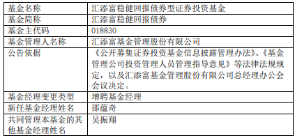 中国经济网北京11月27日讯今日,汇添富基金公告,汇添富稳健回报债券增聘邵蕴奇。