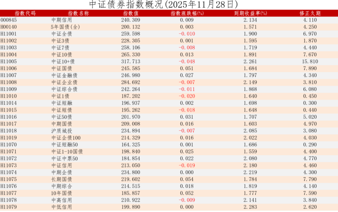 当日中证债券指数多数上涨。中证全债指数较前日下跌0.010%,到期收益率1.900%,修正久期6.97。当日涨幅居前的三条指数是长期国债指数、10年国债指数和中证国债指数,分别上涨0.054%、0.052%和0.051%。