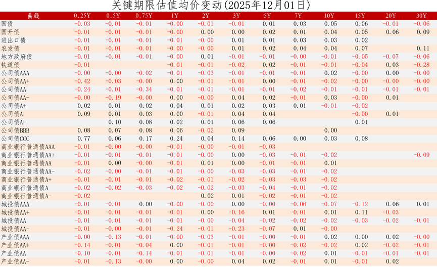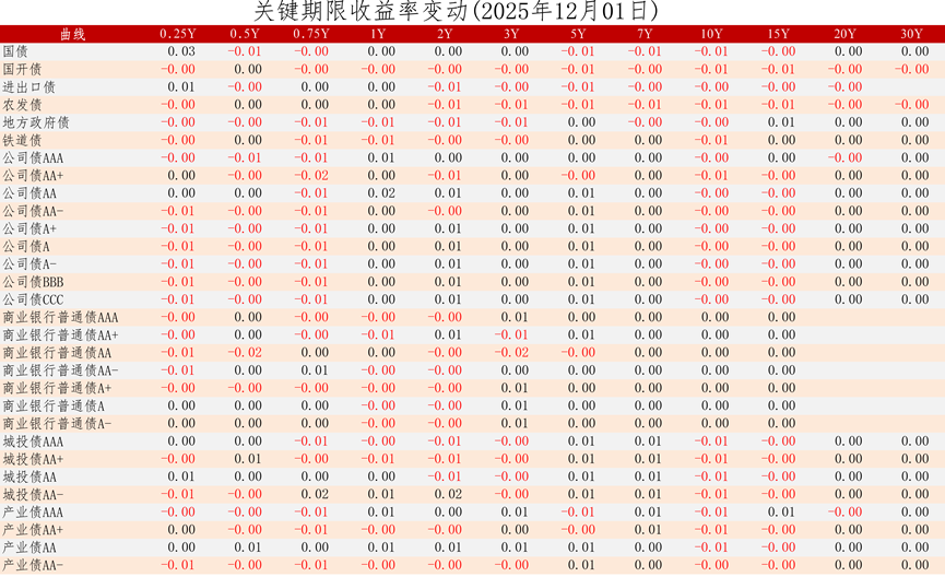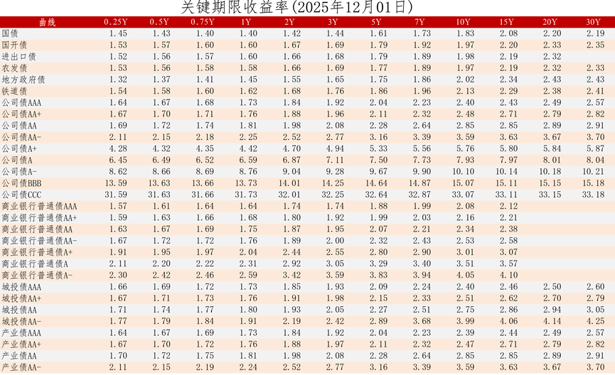 今日利率债市场收益率整体下行。国债收益率整体波动-1BP到0BP,10年国债收益较前日下行1BP至1.83%;国开债收益率整体波动-1BP到0BP,10年国开收益率较前日下行1BP至1.97%。