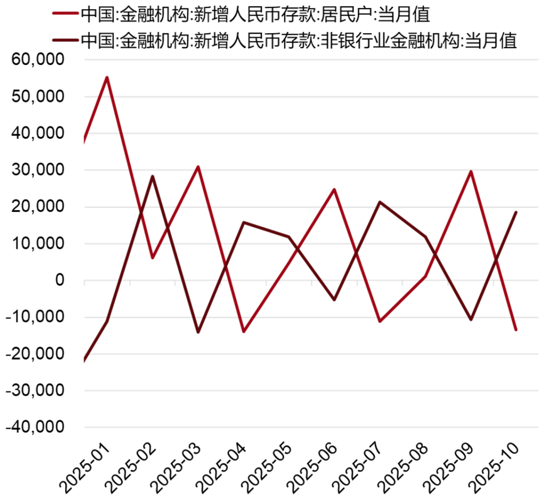 简单聊一下对于债券类投资而言,之前的股债跷跷板效应对资金的影响,以及大家比较担忧的存款搬家事件会不会削弱或压制银行配置债券的力量。首先看居民存款和非银金融存款这两个指标的走势:一个反映大家的存款情况,另一个能在一定程度上体现理财或股市资金的流向,两者呈现此消彼长的关系,从数据上能清晰看出资金的流动趋势。