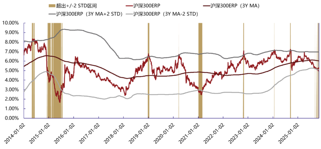 图中红色曲线是沪深300股权风险溢价率的变化情况,中间相对平滑的深红色曲线是其三年移动平均,上下两条曲线(深灰色与浅灰色)分别是三年移动平均的正两倍标准差和负两倍标准差。自2014年以来,风险溢价率指标大多在正负两倍标准差区间内运行,当指标触及或超出这一区间时,往往会迎来反转:触及上行边界时,提示股票资产可能被低估,此时买入股票更具性价比;触及下行边界时,说明股票资产可能被高估或债券资产被低估,此时债券资产更具性价比。