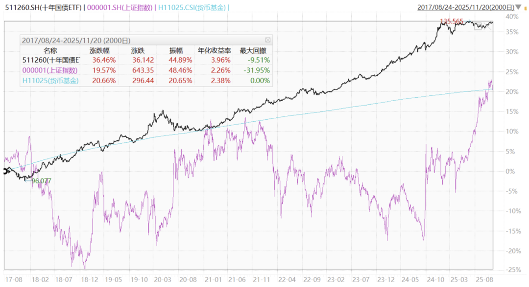 上证指数虽突破近10年新高,但长期波动剧烈。而十年国债ETF自2017年8月上市以来,净值走势屡创新高,8年累计涨跌幅达36%左右,不仅高于同时期上证指数的涨跌幅,收益表现更优,且波动回撤更小。货币基金则走势平稳,收益率相对偏低。由此可见,从长期视角来看,债券类资产是较为优质的配置选择。