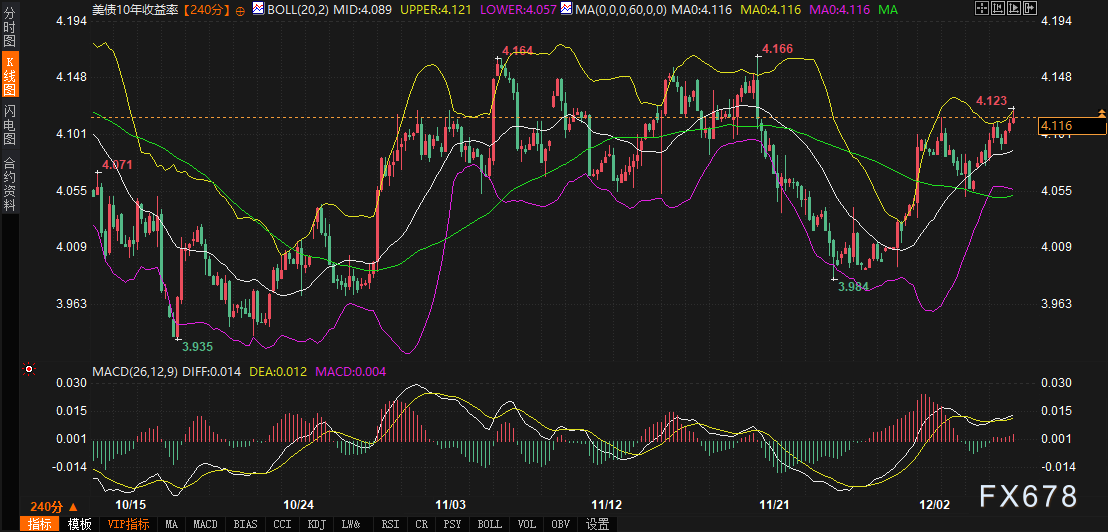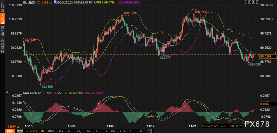 从美债传导至美元的逻辑,已超越了简单的“降息利空美元”的层面。美元指数目前紧贴4小时布林带中轨99.07下方运行,下方关键支撑位于98.66。其疲软表现,一方面固然源于美联储的鸽派预期,另一方面,更受到非美央行政策预期的强力挤压。日本央行本月加息的预期不断升温,推动日元兑美元升至近三周高位,对美元指数构成直接拖累。知名机构ING的市场主管指出,美元承压源于市场相信美联储将降息,且预期候任主席哈塞特可能推行更鸽派的政策。这揭示了美元当前的“政策天花板”:在美联储即将开启宽松,而其他主要央行(如日本央行)可能收紧或按兵不动的“政策预期差”背景下,美元资产的相对吸引力正在被重新评估。