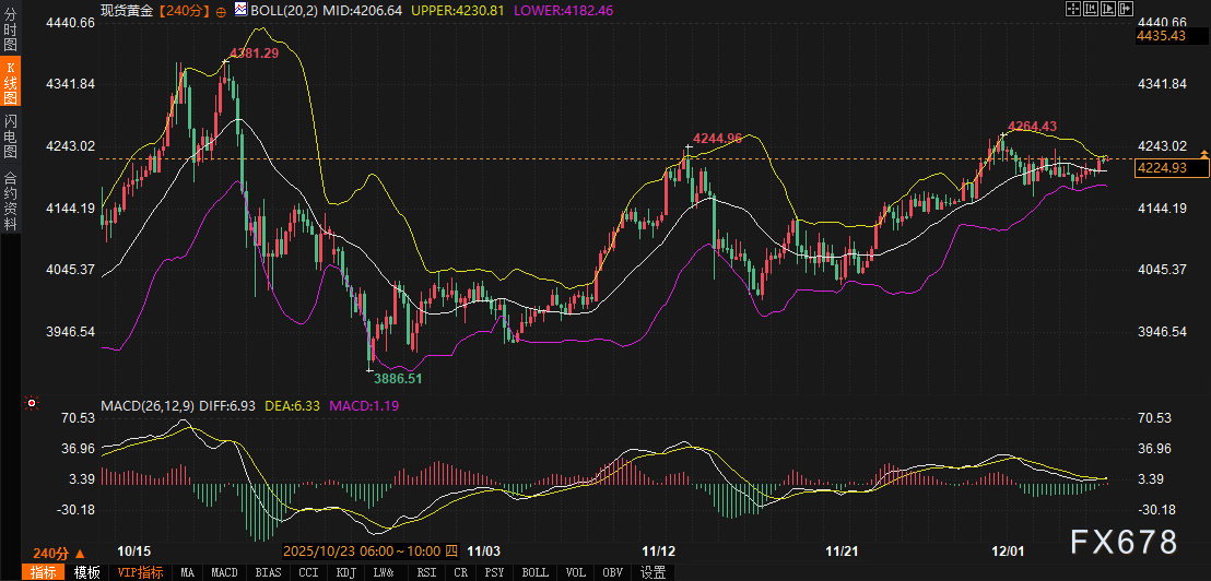 技术面上,现货黄金4小时图处于震荡偏强格局。价格运行于布林带中轨4206.58美元与上轨4230.58美元之间,MACD指标位于零轴之上,显示短期多头动能保持。关键支撑阻力区间明确:下方首要支撑在4206美元(布林带中轨),坚固支撑带位于4180-4185美元(前期震荡下沿与布林带下轨重合区域)。上方直接阻力在4230美元(布林带上轨),有效突破后,价格有望测试4250-4260美元的前期高点区域。投资者需密切关注金价对这些技术边界的测试,尤其是在关键数据公布时。