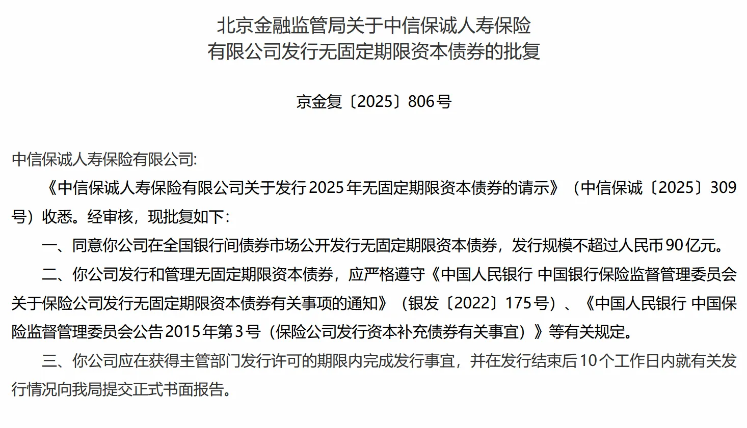 中信保诚人寿获批发行不超过90亿元无固定期限资本债券
