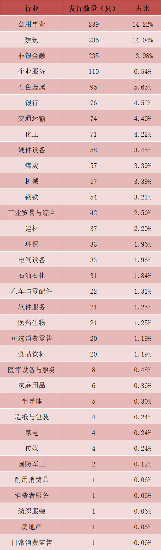 从行业分布来看,公用事业、建筑、非银金融行业为科创债发行主力,发行数量均在230只以上,发行占比为14%左右。据中证鹏元研究,建筑装饰、公用事业等行业的发行人占比靠前,是因为该类主体主要系央企及省属企业,资本实力雄厚,或符合科创企业类发行人在研发投入、营收、核心技术等方面的要求,或将募集资金用于科创升级,从而顺利发行科创债。