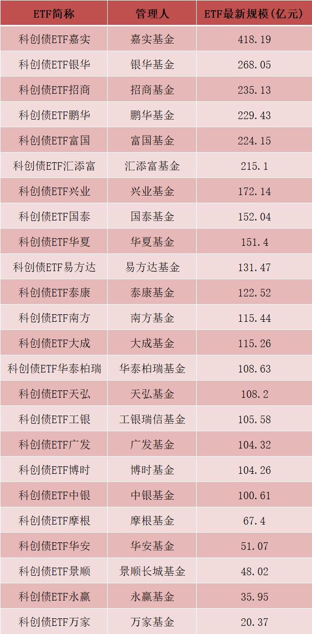 今年7月,首批10只科创债ETF获批上市后,迅速吸引资金流入,规模突破千亿元;第二批14只产品于今年9月发行,进一步丰富产品供给。截至12月29日,24只科创债ETF的规模合计达3404.72亿元,其中,嘉实中证AAA科技创新公司债ETF的规模达418.19亿元,为24只科创债ETF中规模最大者,银华中证AAA科技创新公司债ETF、招商中证AAA科技创新公司债ETF、鹏华上证AAA科创债ETF、富国中证AAA科技创新公司债ETF、汇添富中证AAA科创债ETF等的最新规模也在200亿元以上。