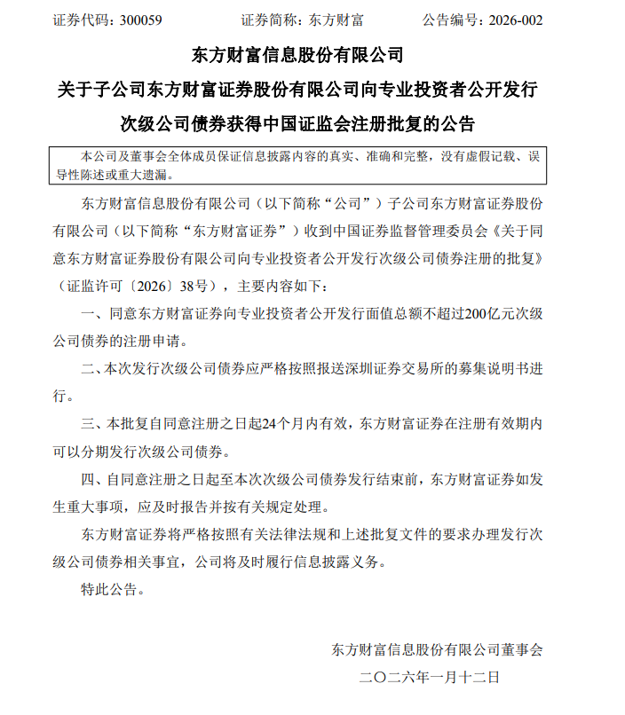 1月12日,东方财富(300059)(300059.SZ)公告称,子公司东方财富证券收到证监会批复,同意其向专业投资者公开发行面值总额不超过200亿元次级公司债券。该批复自同意注册之日起24个月内有效,东方财富证券可在注册有效期内分期发行。