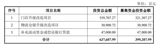 具体而言,门店升级改造项目计划投资总金额55.97亿元,拟使用募资金额32.13亿元,占本次募资的80.49%;物流仓储升级改造项目计划投资总金额3.09亿元,拟使用募资金额3.09亿元,占本次募资的7.74%;补充流动资金或偿还银行贷款计划投资总金额4.7亿元,拟使用募资金额4.7亿元,占本次募资的11.77%。