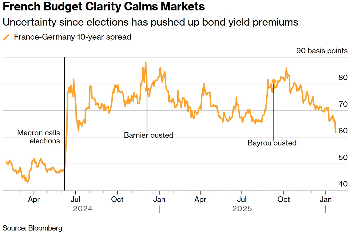 随着法国在预算解决方案上取得进展,紧张局势在最近几周有所缓解。法国10年期国债与更稳健的德国国债之间的利差已收窄至约60个基点,有望创下自2024年6月总统埃马克龙宣布立法选举以来的最小收盘利差。