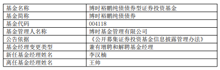 博时基金旗下2只债基增聘李汉楠 王帅离任
