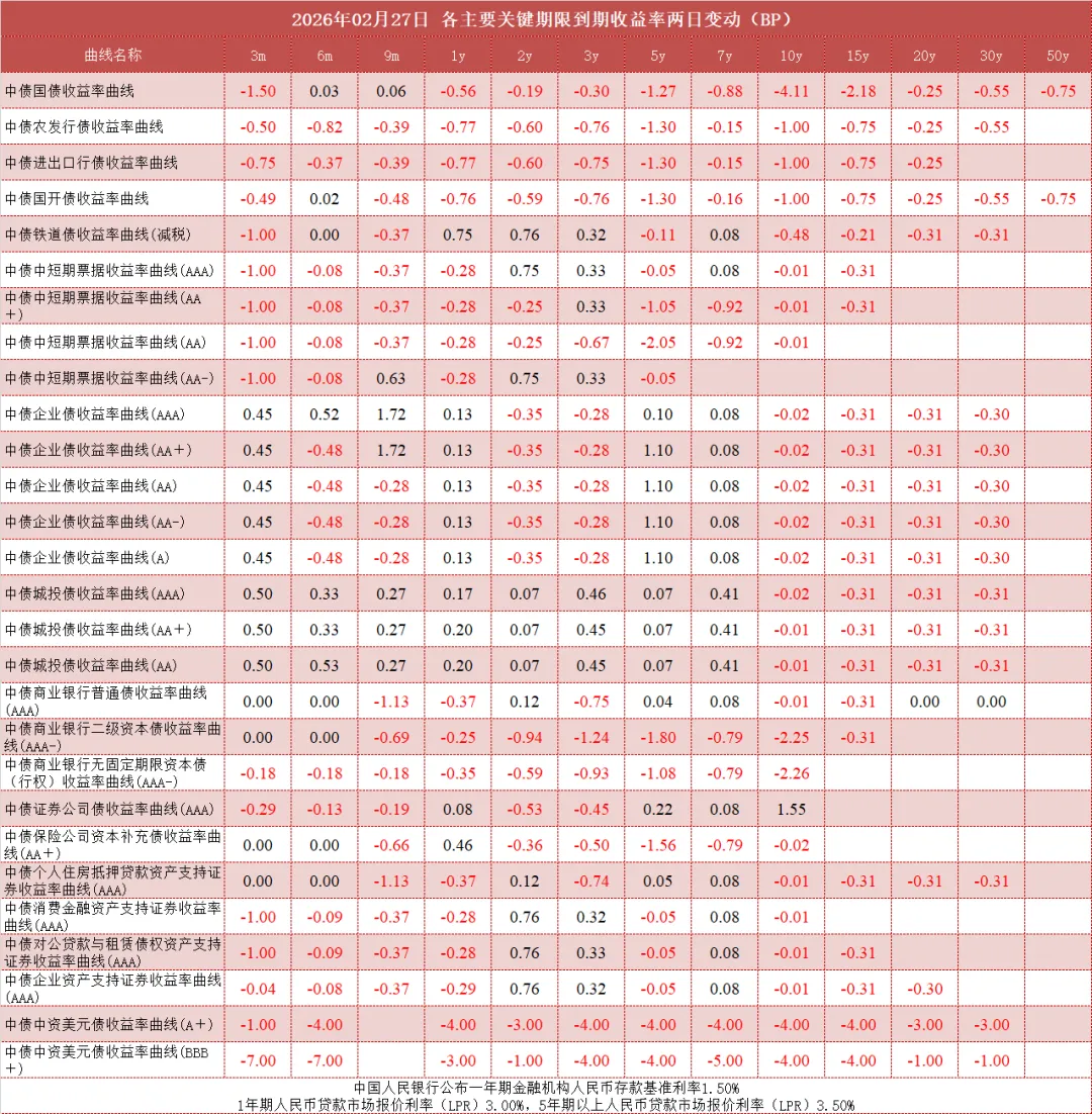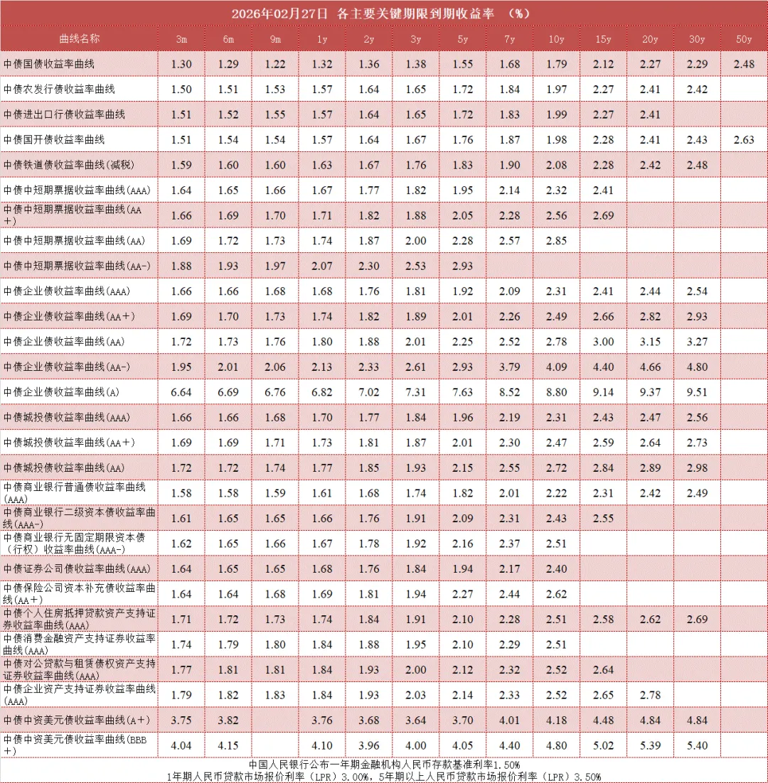 债市值言:中债收益率曲线和指数日评2026年2月27日
