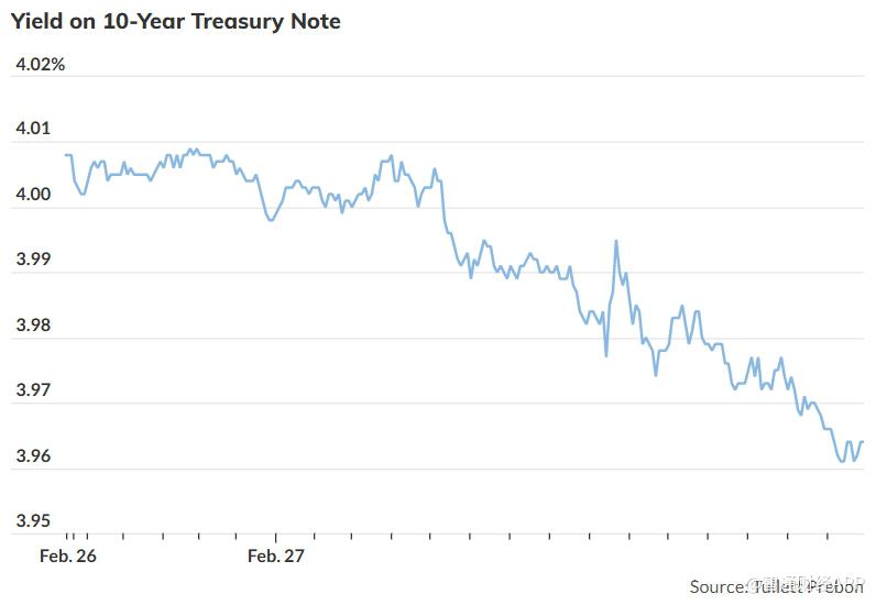 10年期美债收益率收于3.96%,30年期国债收益率降至4.63%,为去年10月下旬以来的最低水平。2月份以来,两项收益率均录得过去一年最大单月跌幅。与此同时,美股三大指数全线收跌,道琼斯工业平均指数下挫逾1%。