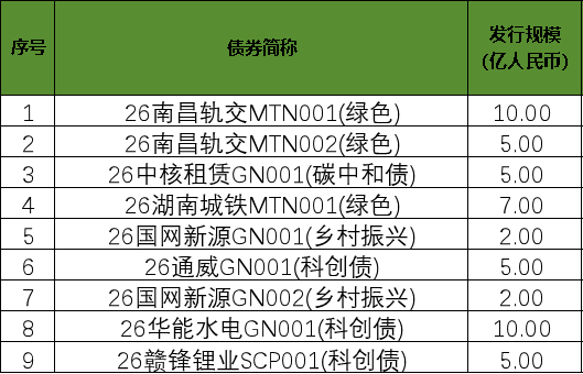 2026年1月符合中欧《共同分类目录》的中国存量绿色债券到期7只。具体情况如下: