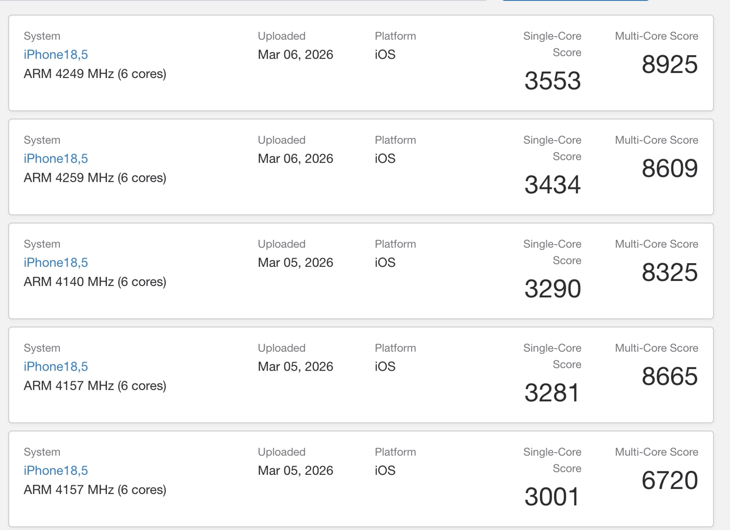 IT之家3月7日消息,苹果iPhone17e手机的跑分现已出现在Geekbench数据库中,让外界得以更清楚地了解阉割版A19芯片的真实表现。