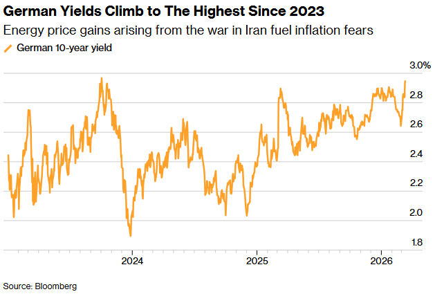 智通财经APP注意到,德国国债价格连续第二天下跌,由于市场担忧伊朗战争将进一步推升通胀,政府借贷成本被推高至2023年10月以来的最高水平。