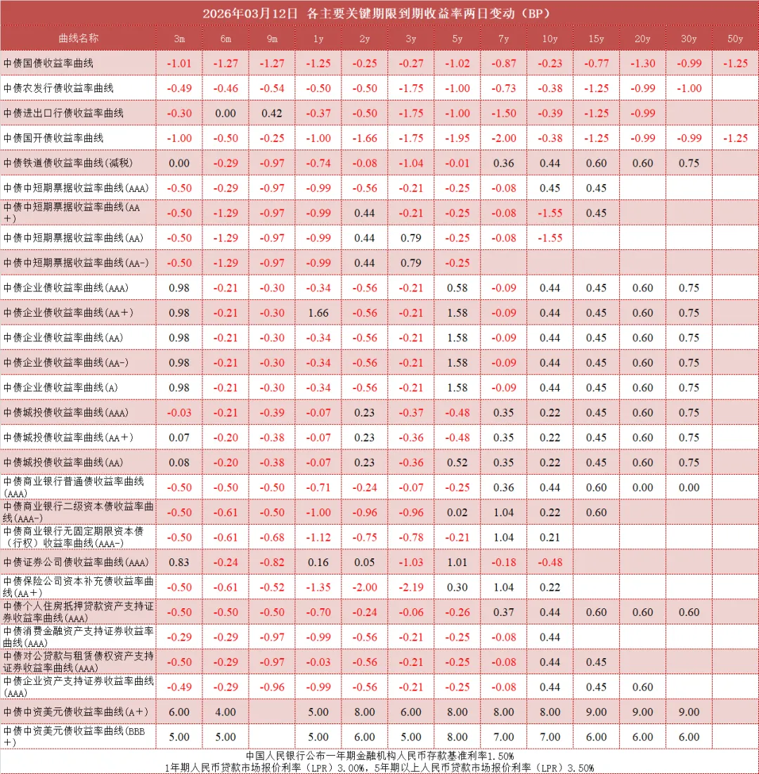 债市值言:中债收益率曲线和指数日评2026年3月12日