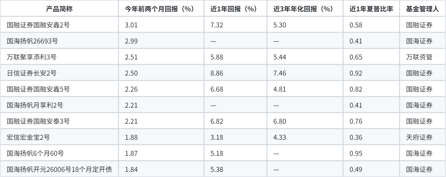 今年前两个月回报居前的“固收+”券商集合理财产品