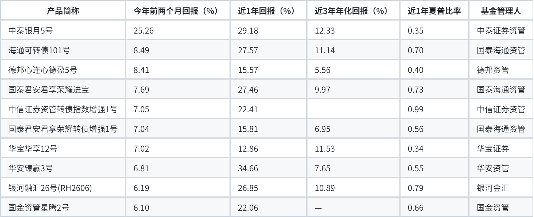 “海通可转债101号”“德邦心连心德盈5号”分别排第二、第三,今年前两个月回报分别为8.49%、8.41%。
