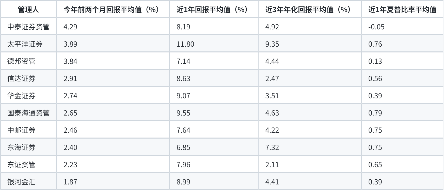 今年前两个月平均回报排前十的券商及资管子公司中,近1年回报不低的有太平洋证券、国泰海通资管、华金证券等。近3年年化回报不低的有太平洋证券、东海证券等。