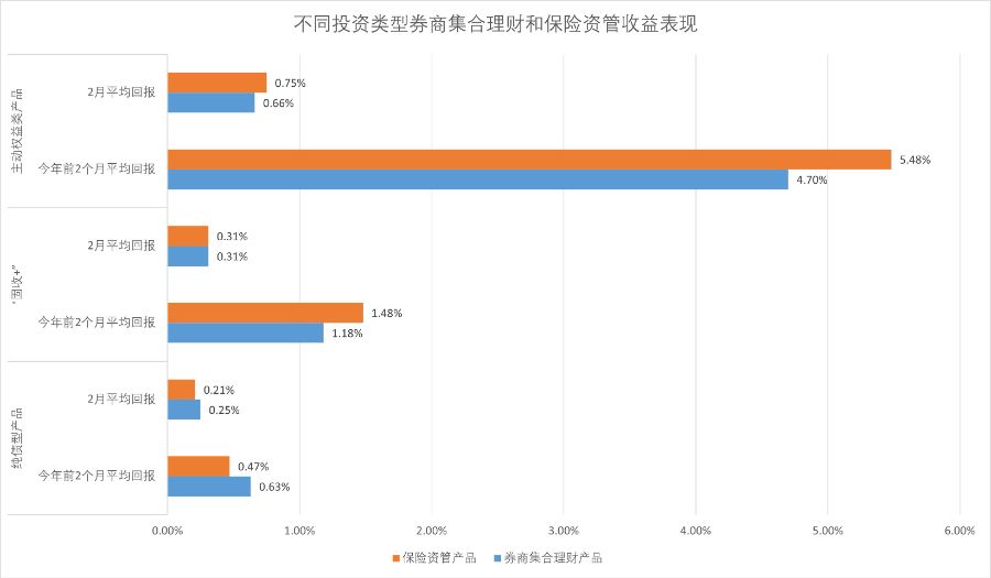 前两个月表现最亮眼的依然为主动权益类产品,其中主动权益类保险资管产品更胜一筹,已实现5.48%的平均收益率,主动权益类券商集合理财产品今年前两个月平均回报为4.7%。