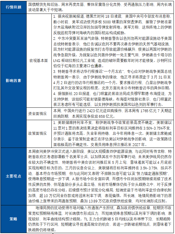 主要观点:本周夜间美伊冲突正式进入新阶段,美以大规模轰炸伊能源设施,与此同时有传言称,特朗普政府正考虑部署数千名美军士兵,以加强其在中东的军事行动,未来美伊战局仍然存在较大的不确定性,特朗普将中美会谈时间推后至5月上旬,意味着其可能以4月底前实现战略目标为目的。三月的议息会议上,美联储将目标利率维持在3.5%-3.75%,按兵不动,基本符合市场预期,但与此同时又表明“不排除加息可能”以及“努力锚定通胀预期”,使得降息预期进一步下调,A股市场今日全面回调,而债市今日则如预期继续延续了技术性反弹的走势,但尾盘部分多头止盈立场,当前市场整体仍处于空头趋势之中,对于反弹的高度市场仍存在分歧。后续债市预计呈现分化格局,短端受益于市场利率定价自律机制加强,超10万亿同业存款或将迎来利率下调,表现偏强。而长端,地缘局势影响下的原油价格上涨带来的再通胀预期,叠加13.89万亿政府债供给放量,均对长端形成压制。