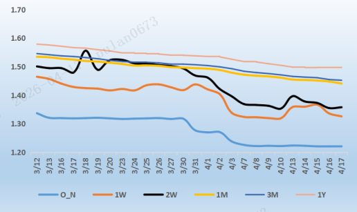 2026年4月17日,今日隔夜、7天、14天shibor利率分别较前一交易日变动0.00BP、-1.00BP、0.30BP至1.2210%、1.3260%、1.3580%;为保持银行体系流动性充裕,人民银行以固定利率、数量招标方式开展了5亿元7天逆回购操作,操作利率为1.40%,与此前持平,同时今日开展2000亿元国库现金定存操作。因今日有20亿元逆回购到期,当日实现净投放1985亿元。