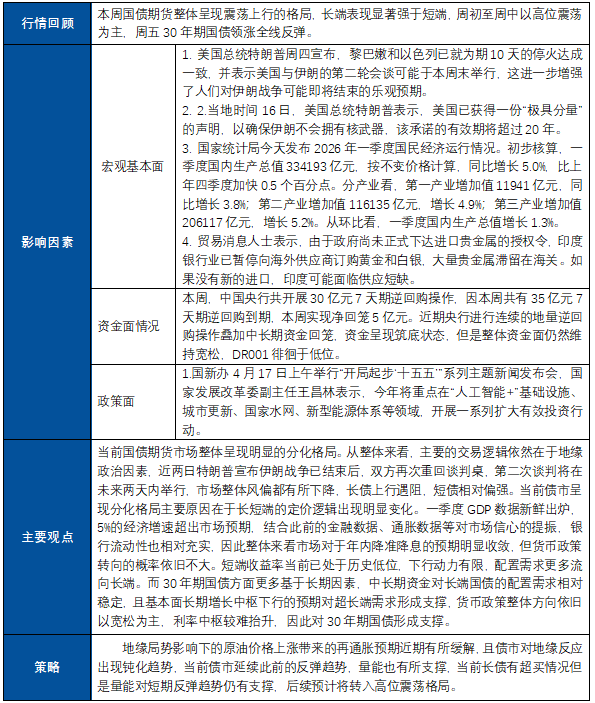 主要观点:当前国债期货市场整体呈现明显的分化格局。从整体来看,主要的交易逻辑依然在于地缘政治因素,近两日特朗普宣布伊朗战争已结束后,双方再次重回谈判桌,第二次谈判将在未来两天内举行,市场整体风偏都有所下降,长债上行遇阻,短债相对偏强。当前债市呈现分化格局主要原因在于长短端的定价逻辑出现明显变化。一季度GDP数据新鲜出炉,5%的经济增速超出市场预期,结合此前的金融数据、通胀数据等对市场信心的提振,银行流动性也相对充实,因此整体来看市场对于年内降准降息的预期明显收敛,但货币政策转向的概率依旧不大。短端收益率当前已处于历史低位,下行动力有限,配置需求更多流向长端。而30年期国债方面更多基于长期因素,中长期资金对长端国债的配置需求相对稳定,且基本面长期增长中枢下行的预期对超长端需求形成支撑,货币政策整体方向依旧以宽松为主,利率中枢较难抬升,因此对30年期国债形成支撑。