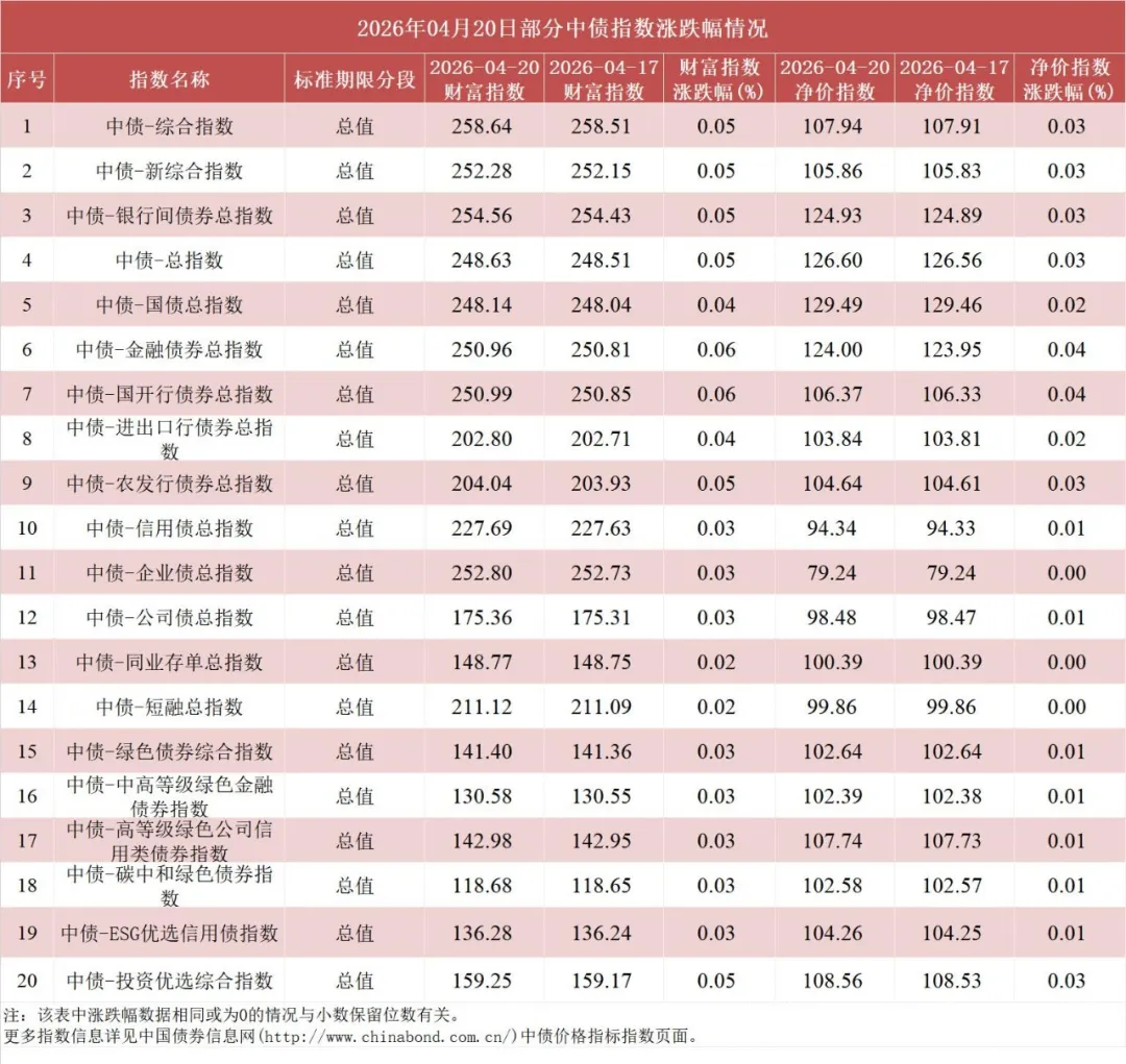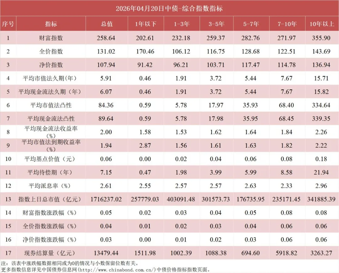 今日债券市场指数小幅波动,其中不包含利息再投资的中债综合指数(净价)107.9394,上涨0.0284%,而包含利息再投资的中债综合指数(财富)258.6396,上涨0.0485%,平均市值法到期收益率为1.9388%,平均市值法久期为5.9149。