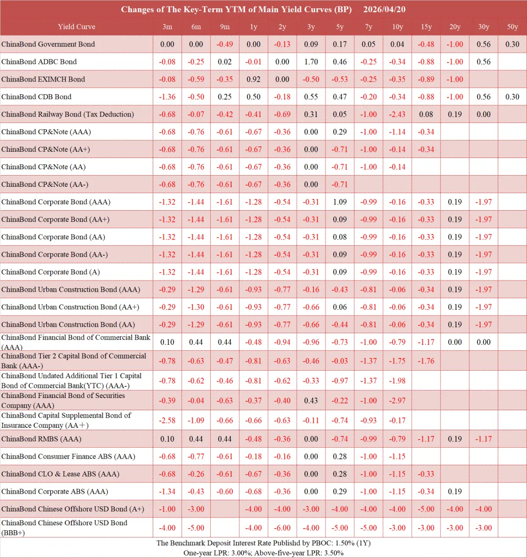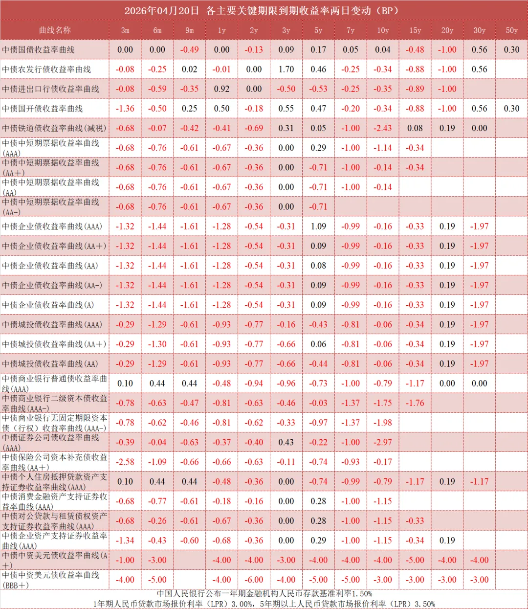 4月20日,2年期国债期货主力合约TS2606稳定在102.562,对应期货收益率上行0.66个基点至1.2805%;5年期国债期货主力合约TF2606稳定在106.200,对应期货收益率上行0.24个基点至1.4614%;10年期国债期货主力合约T2606上行0.02%至108.715,对应期货收益率下行0.15个基点至1.6244%;30年期国债期货主力合约TL2606上行0.01%至113.270,对应期货收益率下行0.25个基点至2.2823%。